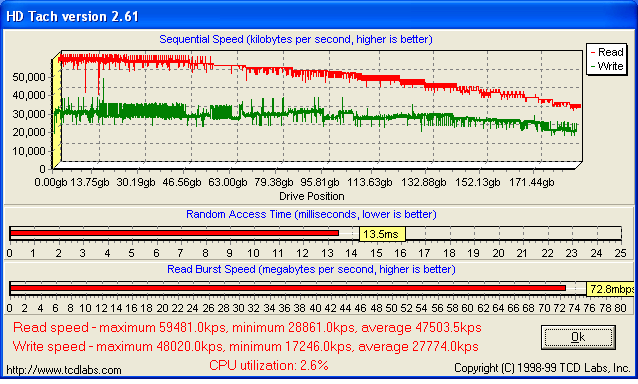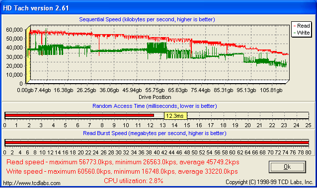 • HDTach – популярный тест, позволяющий измерить скорость чтения и записи на пластины, а также скорость доступа к случайным данным (random access time). Особый интерес представляет тест на скорость записи.